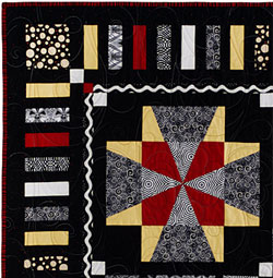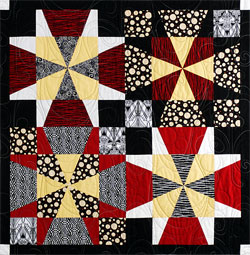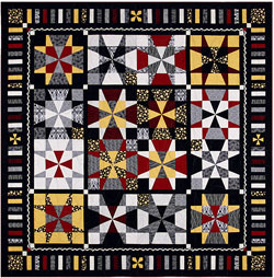 This quilt, made from sixteen 14” Op-Art Kaleidoscope blocks, is surprisingly easy to construct using my method with no wedge-shaped templates or triangular rulers. Cut the wedges and kites with a regular ruler, mix the pieces and assemble large Kaleidoscope blocks. Slice these blocks and play. Students are encouraged to experiment and explore some of the many options for switching the diced pieces to generate interesting looking Op-art Kaleidoscope blocks for their own unique quilt.