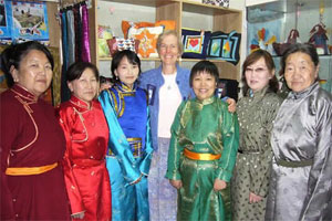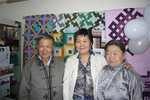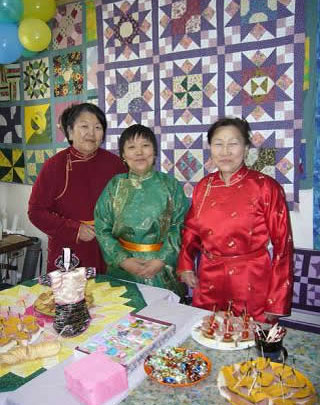 In July 2009, Carol Gregory and I returned to Ulaanbaatar, Mongolia to visit the new Mongolian Quilting Center purchased with funds raised from our capital campaign in 2007 and 2008. What a thrill it was to see the facility and the community of women working there. The shop was inviting with a large variety of products and they did a brisk trade with the tourists, many of whom spotted it from across the street whilst dining at Bd’s Mongolian Bbq. The classroom was constantly busy with women sewing and attending classes. The facility also includes a small office for Selenge Tserendash and a tiny bathroom. During our stay, a delegation of five women from Japan visited and we had a celebration at the Center. Local government officials from the Sukhbaatar District attended and presented us with certificates of appreciation. The seamstresses and teachers dressed in their best deels and it was a wonderful gathering to celebrate the success of our campaign. Click here to see more pictures of the Center.