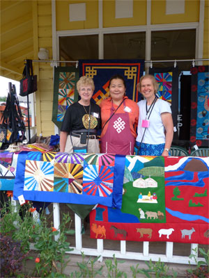 The quilt show was extremely successful netting over $7,000 for the Mongolian Quilting Center! Around 2.00 p.m. the heavens opened for 40 minutes of torrential rain and violent thunder and lightning. For the first time in the 37 years of Sisters Quilt Shows, the 1,200 quilts in this huge outdoor quilt show had to be taken down in a hurry and the show was closed. Our booth was on a large wrap around covered porch and the exhibit quilts were hanging on the outside edges. The quilts were taken down, but the booth remained dry and we stayed busy constantly until 5.00 p.m. making sales and talking to people. |