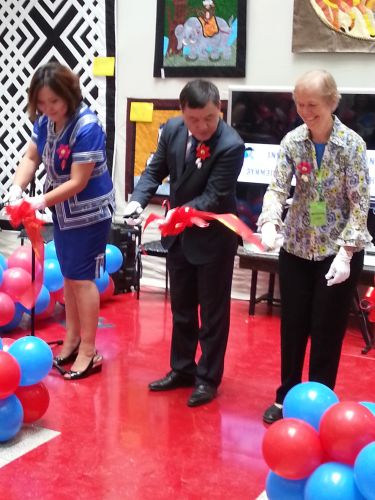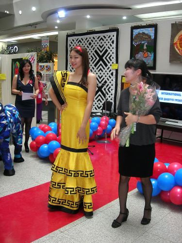 The quilt show opened with much pomp and ceremony the next morning. At 10.00 a.m., the time at which people were invited to the opening ceremony, balloons were being blown up and a bed was being constructed in one corner to display quilts for sale. Products were still being arranged in the sales area and there was much activity. We began at 11.00 a.m. with some Mongolian music. Then there were speeches from Selenge, me and Ogawa-san Hiromi from Japan with translations. A fashion show of amazing dresses followed, all designed by Shiilge Bat-Ulzii, one of the Mongolian designers at the Center. The show was declared open after an elaborate ribbon cutting ritual. Four of us participated including me and were each given white gloves and scissors that came on a silver platter, I was joined by Selenge Tserendash, the Mongolian Minister of Labor (who also presented Selenge with certificates) and Ogawa-san Hiromi from Japan. After we had cut the ribbon, the silver platter reappeared with four fancy champagne flutes filled with milk for us to drink. Traditionally this would be airag which is fermented mare's milk and not a delicacy that I would choose to drink! Fortunately, they used ordinary milk! I just copied the others and drank about half of the milk. TV and radio people were there and a good number of people watching and there was much applause.