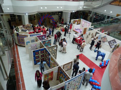 The quilt show took place in The State Department Store in the center of town. At the 2006 show in the same place, we tethered the quilts with safety pins to beds in the furniture department on the 4th floor. This year we had a fabulous location on the second floor in a large space between the escalator going up and the escalator going down. People could see the quilts as they went up and down between floors. The picture shows the view from the third floor. Hanging the quilts was challenging. Selenge's brother owns a furniture company and his company provided large heavy wooden panels which stood on bases. These had to be covered in cloth after they were erected so that we could attach the quilts. It worked fine, but the problem was the length of time it took to put them all up. We began hanging half of the room at 5.00 p.m., but the second half wasn't ready until 8.30 p.m. The quilt hanging went quickly with the help of the Japanese ladies. As soon as I got the go ahead, I decided where to put each quilt and we pinned them up. On the first side we hung all the quilts from USA and UK and the three from Australia. It wasn't quite clear how many Mongolian quilts we would have, and not all of them had labels. The Japanese brought eight small quilts and about 15 beautiful hand-made purses. They made a nice display area for these. By good fortune, the spacing worked out fine and all the quilts were hung by 10.30 p.m. We retired to bed and left the Mongolian women arranging their products until 12.30 a.m.